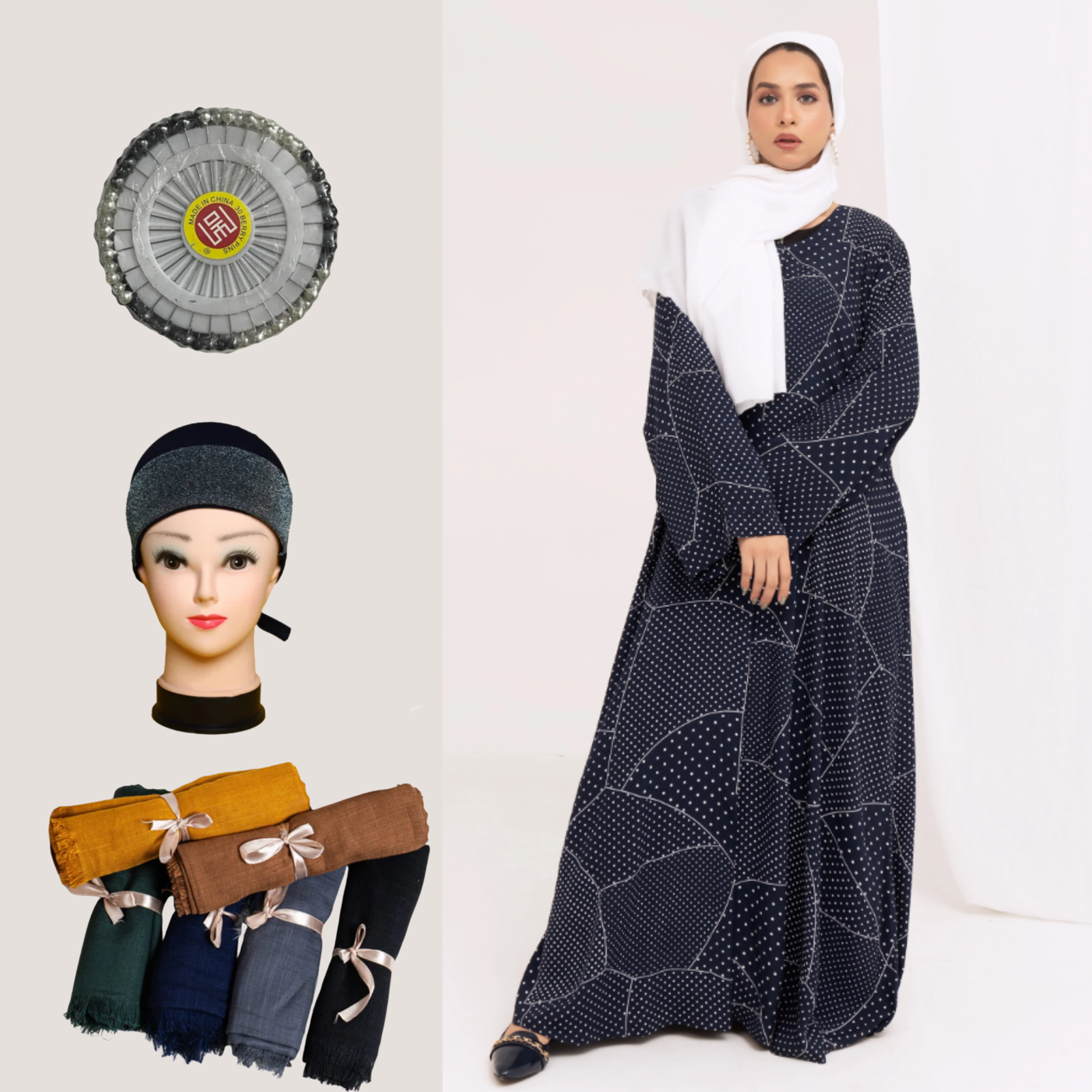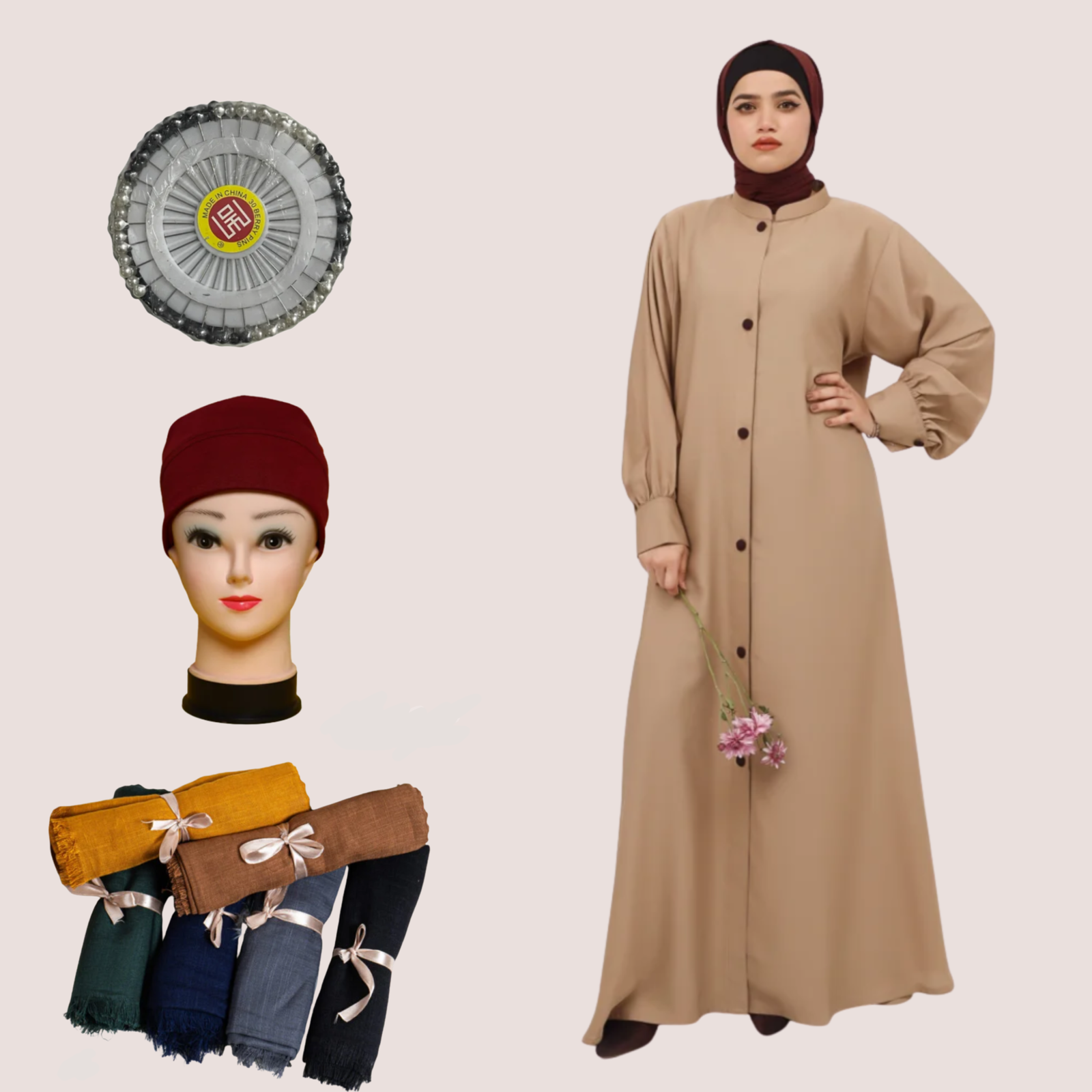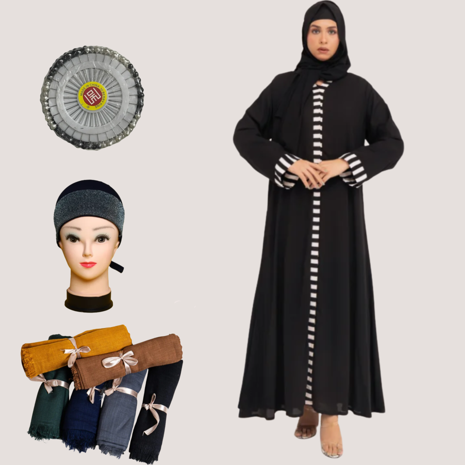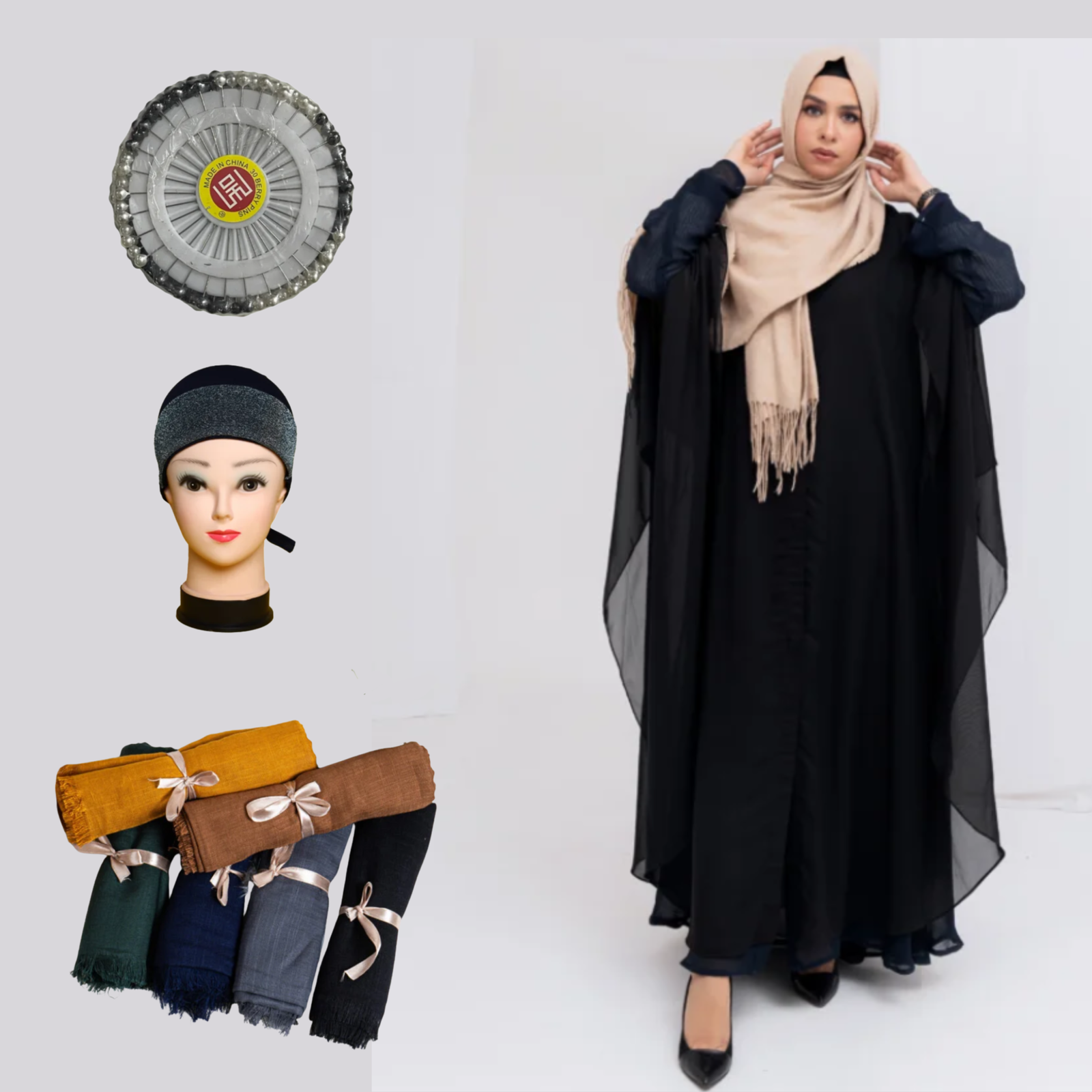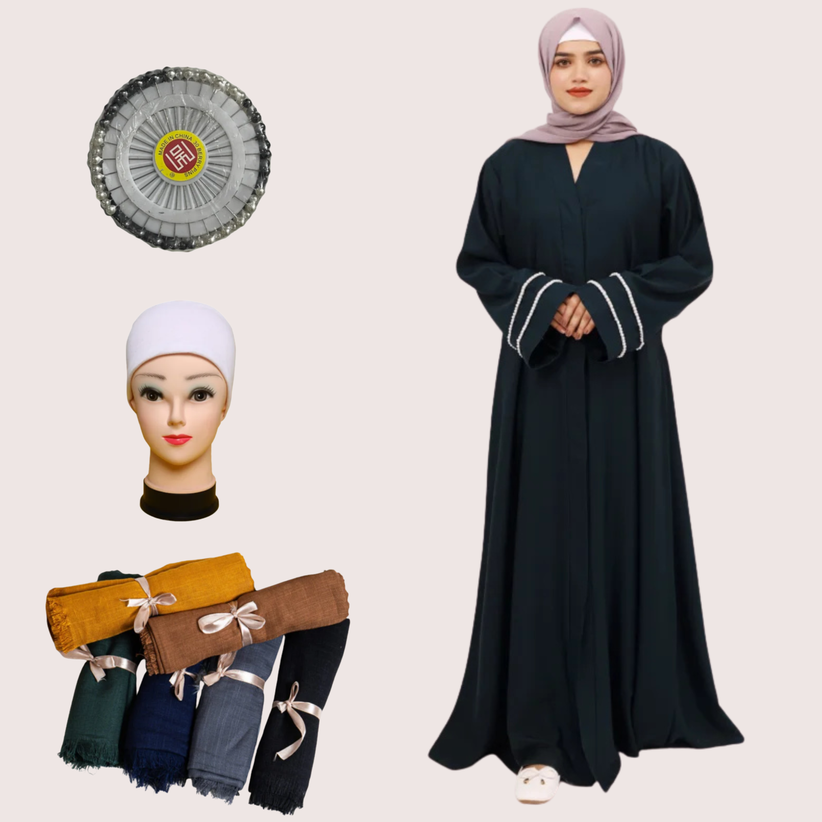 Premium Abaya Pack is a special offer where you can select any premium abaya from our Hinna Collection, and with the abaya you will receive one premium hijab of your choice, either Georgette or Chiffon. Along with this, a hijab cap and hijab pins are included completely free. If you want help selecting your abaya, hijab, or cap, you can contact us on WhatsApp, however the order must be placed through our website only. This offer gives you a complete, elegant look with premium quality at the best value.