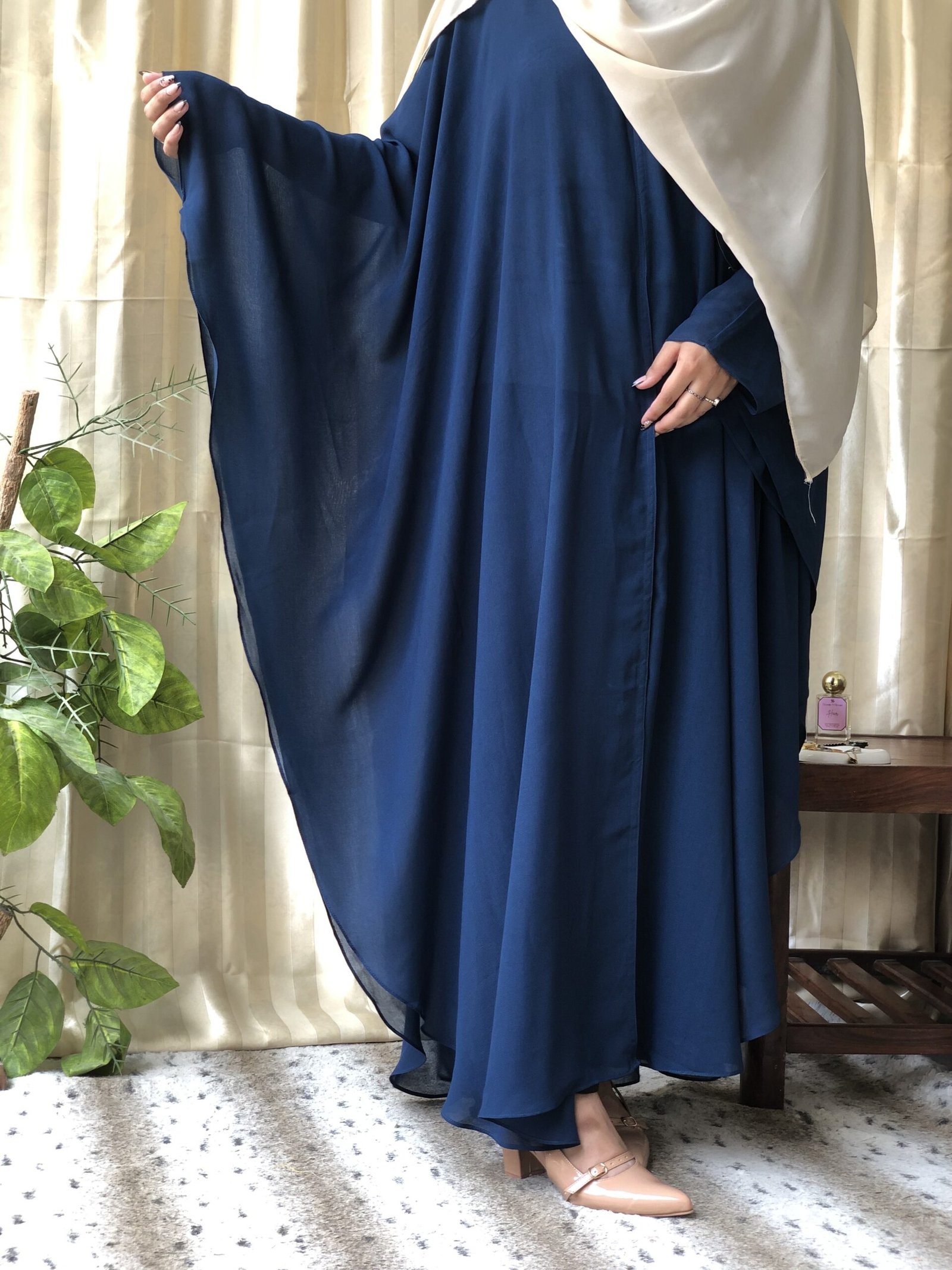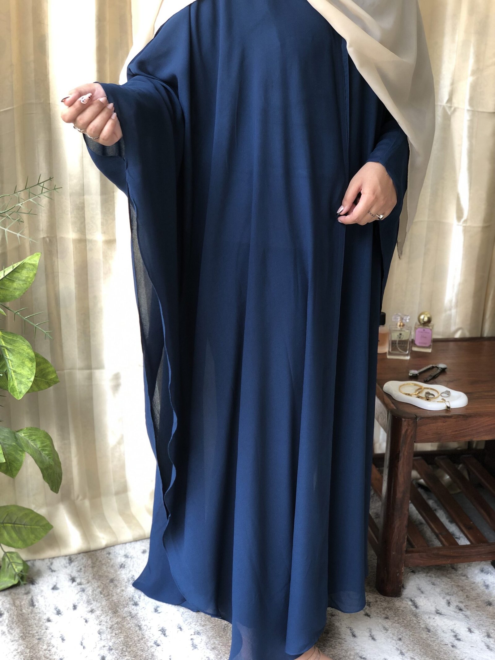 Embrace timeless elegance with our Front Open Wool Chiffon Jilbab Abaya in a rich navy blue shade. Crafted from premium wool chiffon, this abaya offers a soft, luxurious feel with a beautiful natural drape that enhances your silhouette while maintaining modesty.
