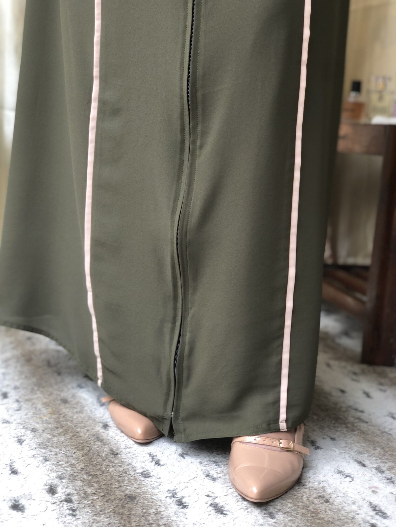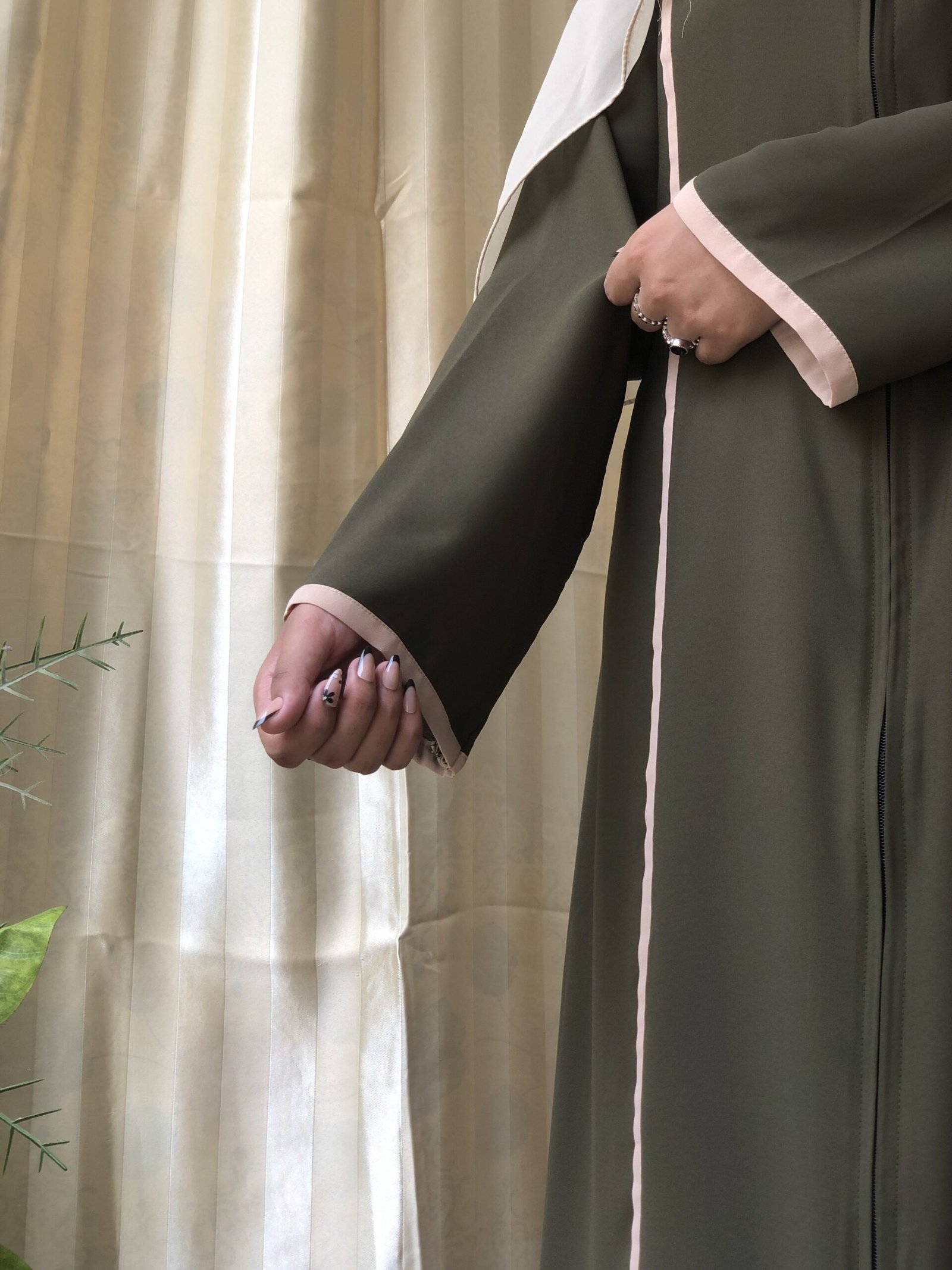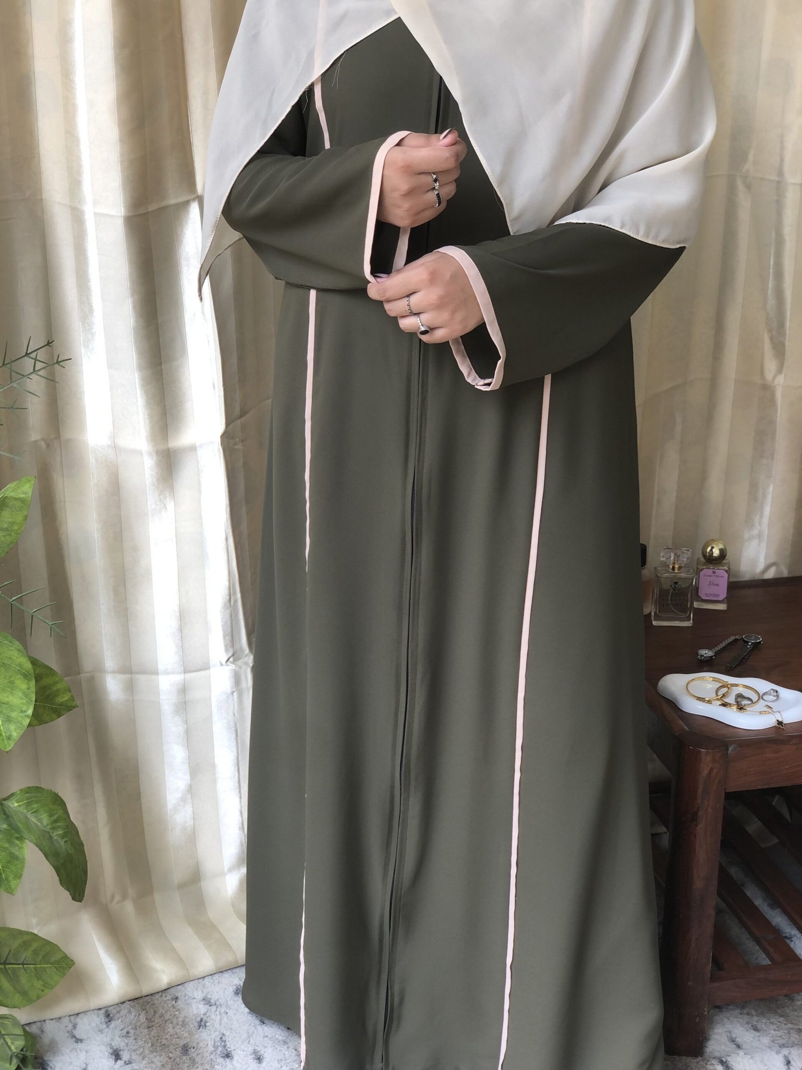 Elevate your modest style with this Olive Contrast Trim Abaya, designed with a sleek silhouette and soft fabric for all-day comfort. The elegant blush pink piping along the front and sleeves adds a subtle feminine touch, making it ideal for both casual outings and semi-formal occasions.