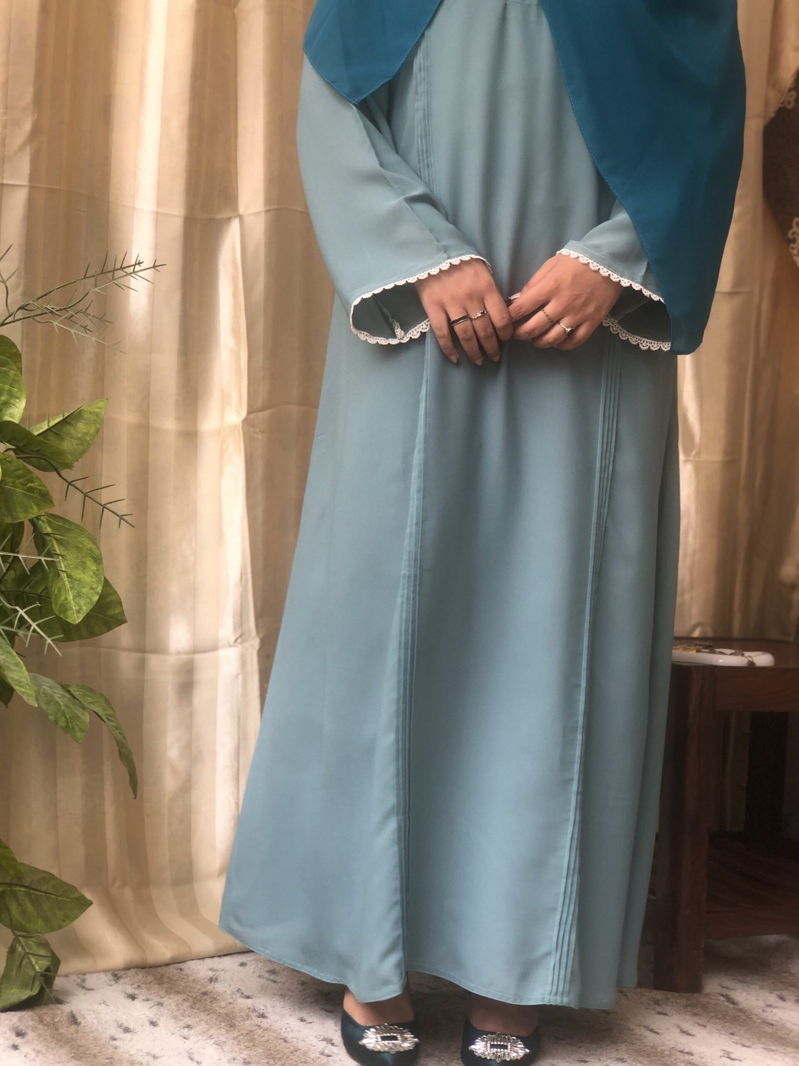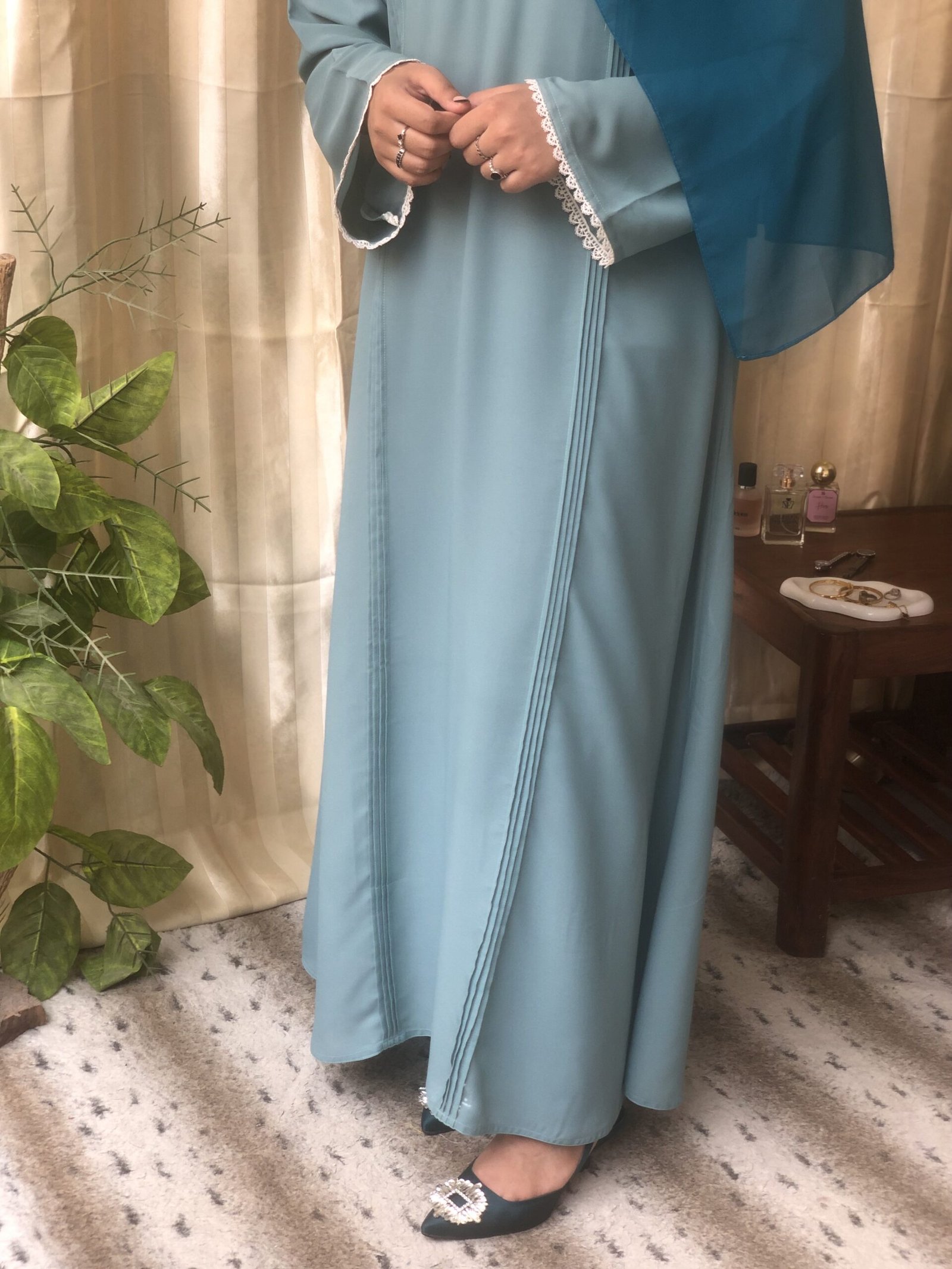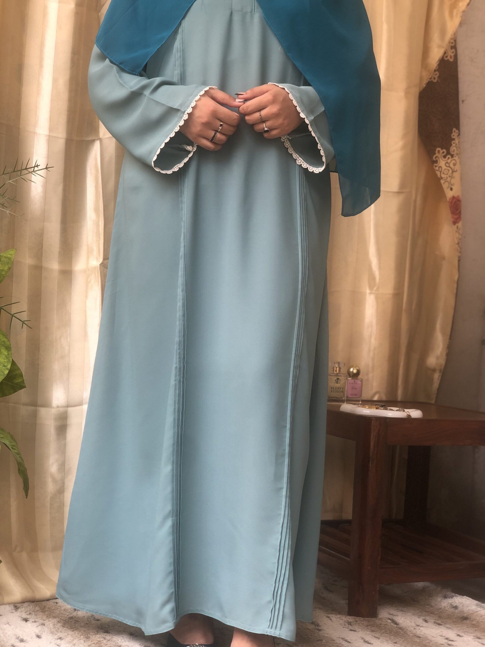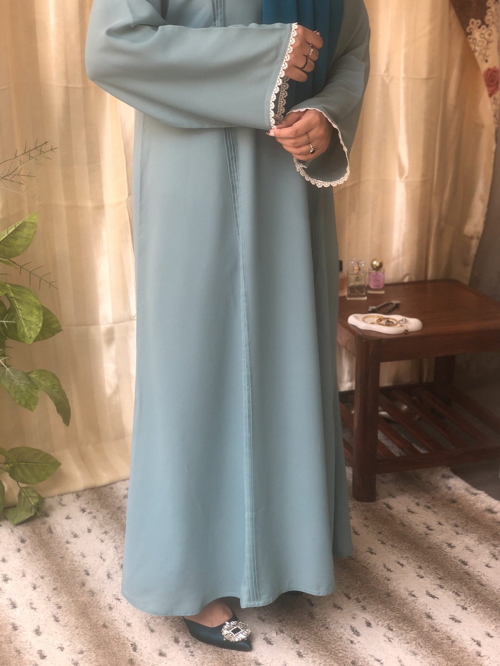 The real highlight lies in the delicate lace detailing on the sleeves, bringing a refined, feminine finish that elevates the entire look. Lightweight, breathable, and effortlessly stylish — this abaya is perfect for both everyday wear and special occasions
